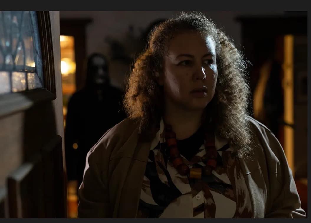 As she walks through the house with her boyfriend on the phone, he tells her she is safe and that her fears of a possible intruder are a result of her consuming too many true crime stories.